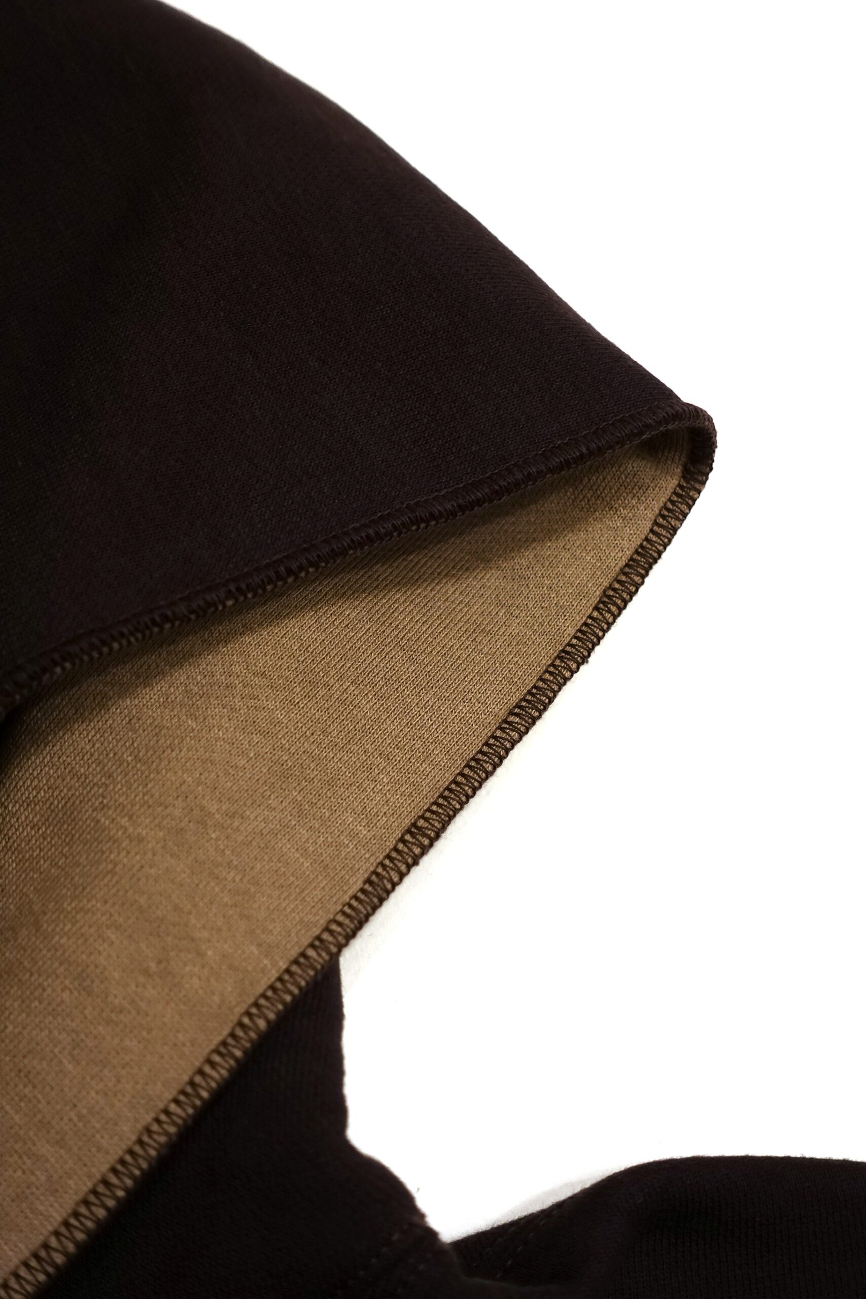フードはダブルフェイスの2重構造で張り合せはロック始末による大変特徴のある仕上がり。