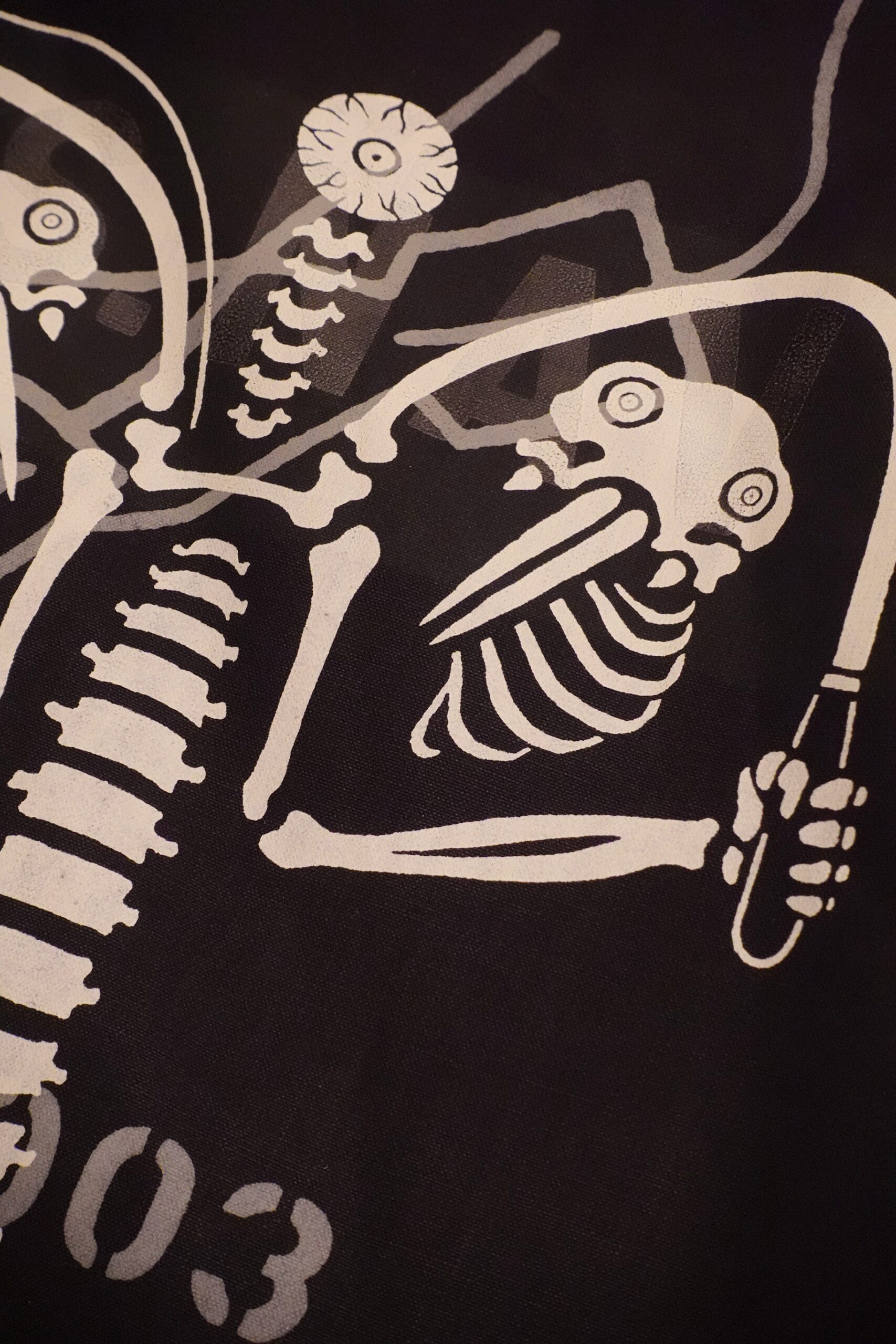 退役後にジャケットを個人でカスタムを楽しみ、プリントの上に骨で出来たバイクのイラスト