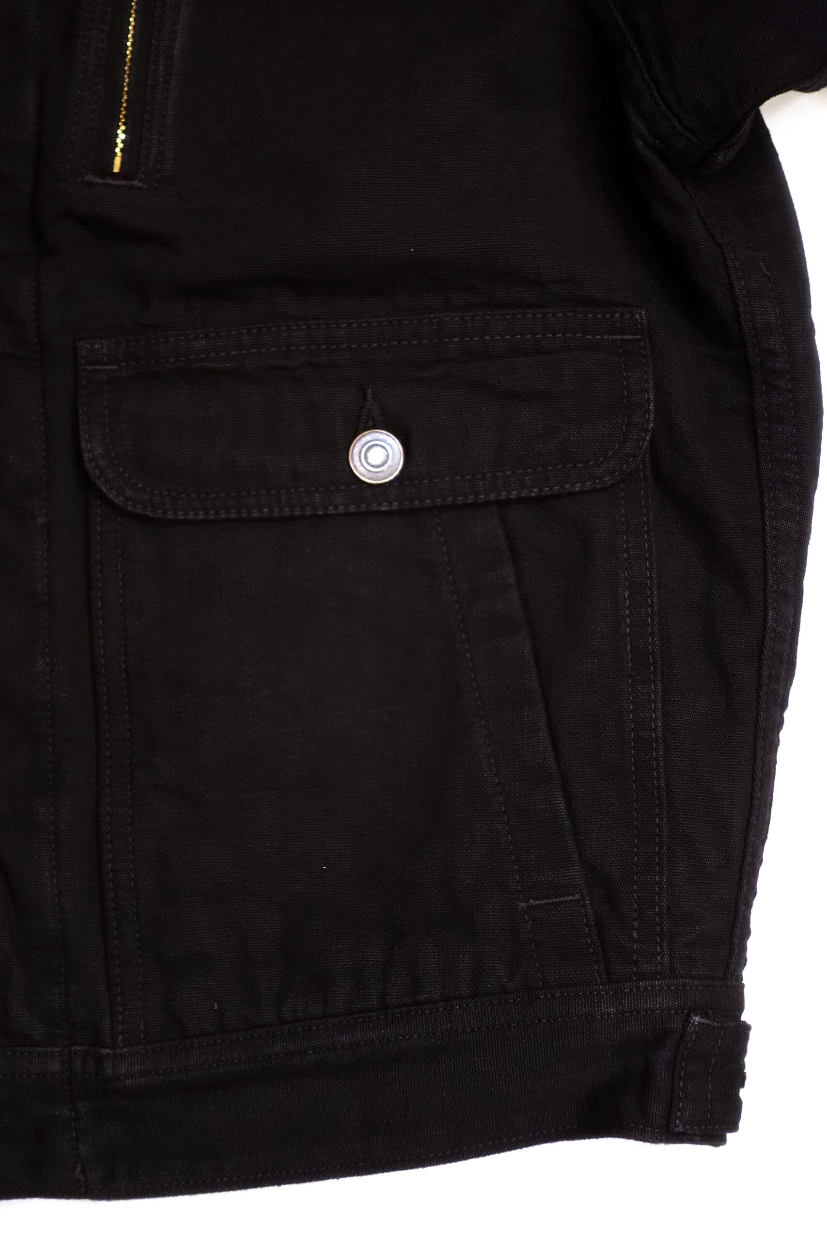 左胸にはやや斜めに取り付けた縦ポケットは7連のダイヤチェーンを引手にしてます。