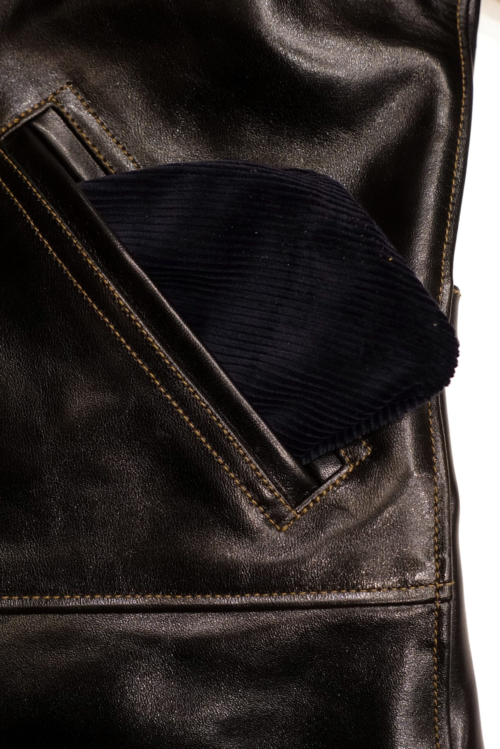 両玉縁仕様のウエスト位置にあるポケットは飾りステッチ入りになります。